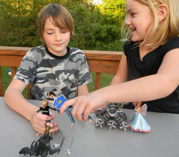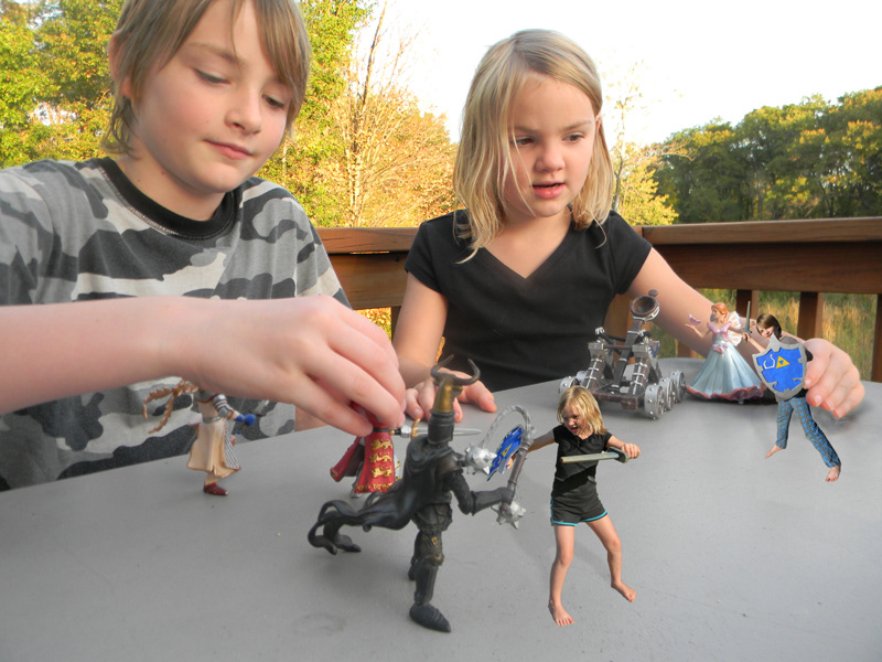 I took pictures of the kids playing with swords and shields and then turned them into figurines for their pretend tabletop games using Photoshop.
