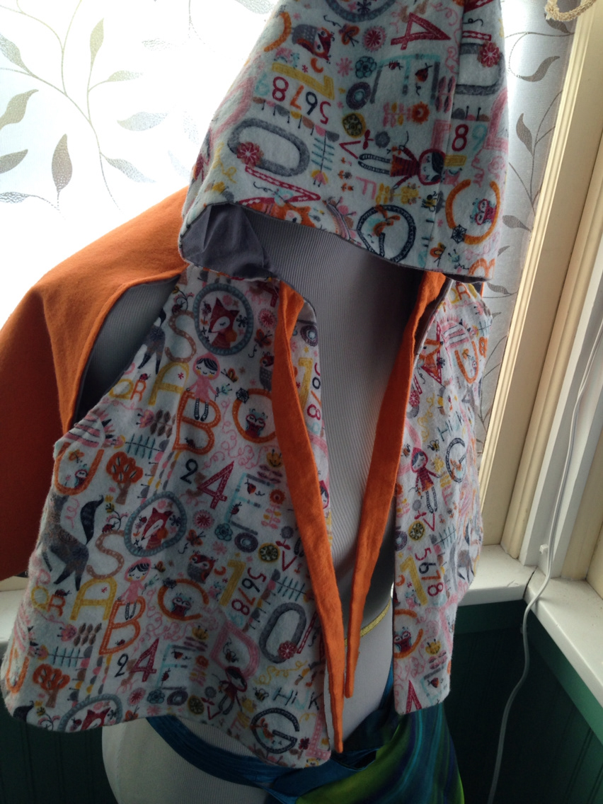I sketched, drafted the pattern and sewed this flannel lined, reversible, toddler cloak with a pointed hood, contrasting tie, arm openings, and a hand embroidered sketch of a girl and her little fox friend